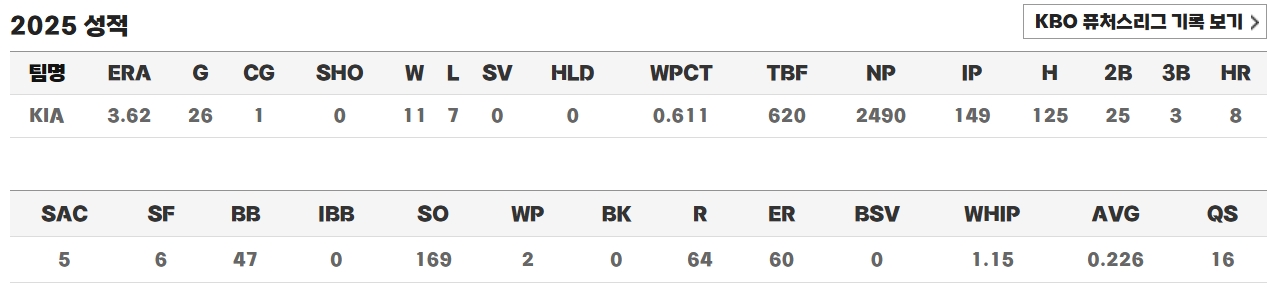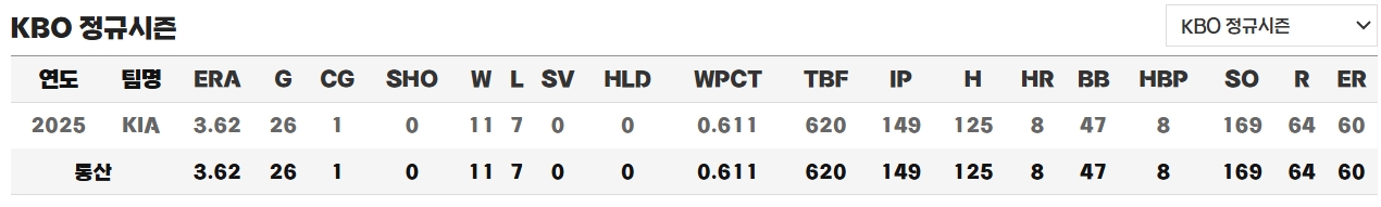 2025시즌 그는 11승을 거두며 평균자책점 3점대를 기록했고, 169개의 탈삼진으로 리그 정상급 구위를 입증했습니다. 제임스 네일과 함께 강력한 원투펀치를 형성하며 KIA 선발진의 중심을 잡았고, 꾸준히 퀄리티 스타트를 기록하는 계산이 서는 투수로 평가받았습니다. 2025년 6월 19일 kt 위즈전에서 기록한 시속 157km는 그의 KBO 공식 최고 구속으로 남아 있습니다.