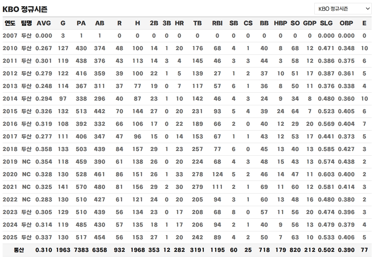 그 후 그는 두산의 우승 4회, 5회에 함께한 프랜차이즈 스타로 자리 잡았고, KBO 골든글러브 포수 부문 최다 수상, 포수 최초 타격왕 2회, 한국시리즈 MVP 2회 등 KBO 역사에서도 보기 힘든 기록을 차곡차곡 쌓아 올렸습니다. 특히 포수 WAR 역대 1위라는 점은 그가 얼마나 팀 전력에 실질적인 기여를 해왔는지 단적으로 보여주는 지표라고 평가됩니다.