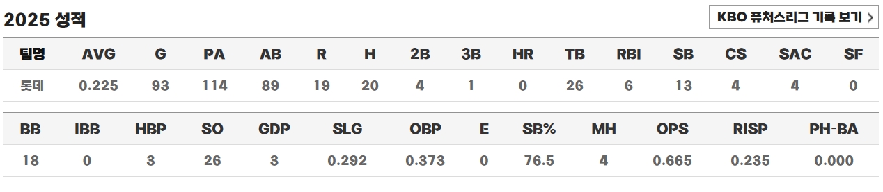 2025년 시즌에는 공격력과 수비에서 다양한 경험을 쌓으며 한층 성장한 모습을 보였습니다. 특히 5월과 6월 동안 대주자 및 중견수로 출전하며 팀의 득점과 승리에 직접 기여했으며, 수비에서는 상대 타자의 장타성 타구를 정확하게 처리하며 팀의 실점을 막는 중요한 순간마다 빛나는 활약을 펼쳤습니다. 또한, 그는 팀 내 다른 외야수들과 달리 뛰어난 순출루율과 선구안을 바탕으로 타격에서 안정적인 모습을 보여주었고, 좌상바임에도 불구하고 좌완 상대 타율에서는 다소 약점을 보였으나 전체적으로는 팀에 안정적인 공격 옵션을 제공했습니다. 2025년 시즌을 거치면서 경험이 쌓인 그는 경기 후반 대수비와 대주자 역할에서도 자신감을 가지며 팀 내 장두성 다음으로 훌륭한 수비력을 선보였습니다.