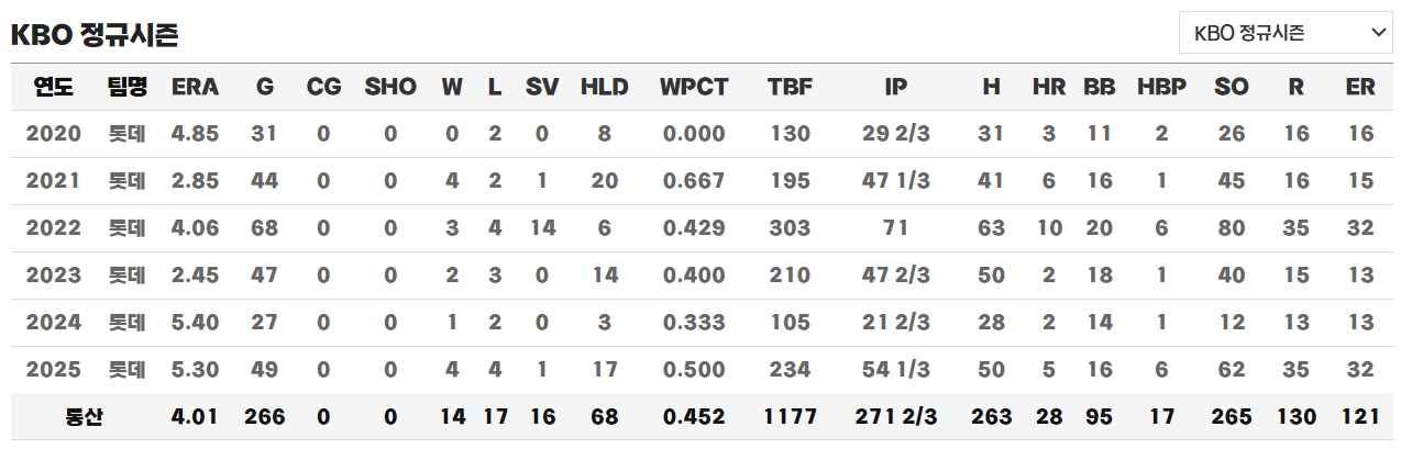 2025년 시즌을 앞두고 그는 부상 재활에 집중했습니다. 1차 스프링캠프 도중 팔꿈치 통증으로 조기 귀국하는 어려움을 겪었으나, 꾸준한 재활 끝에 시즌 중반부터 복귀했습니다. 부상 복귀 이후에는 완전히 달라진 투구를 선보였습니다. 시즌 49경기에 등판하여 54.1이닝을 던졌고, 4승 4패 1세이브 17홀드, 평균자책점 5.30을 기록했습니다. 단순한 성적만 놓고 보면 아직 완전한 회복세라고 보기는 어렵지만, 구속과 구위 모두 이전보다 향상된 모습을 보였습니다. 재활 과정에서 투구폼을 조정하며 하체 밸런스와 팔 스윙의 타이밍을 개선했고, 그 결과 평균 구속이 150km/h까지 회복되었다고 합니다.
