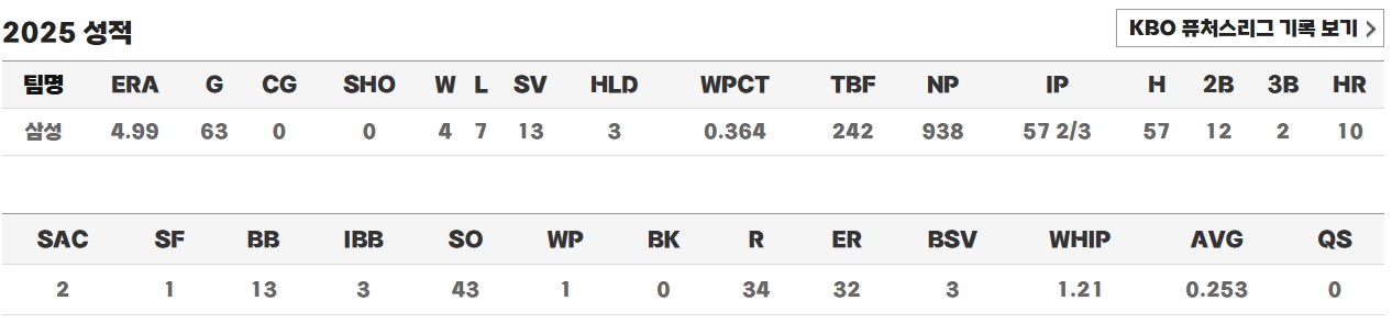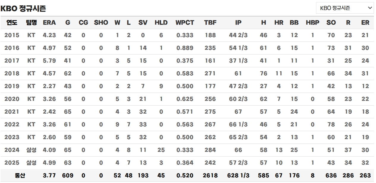하지만 2025시즌은 그에게 쉽지 않았습니다. 63경기에서 4승 7패 13세이브 3홀드, 평균자책점 4.99로 커리어 최악의 시즌을 보냈습니다. 전반기에는 극심한 부진으로 비판을 받았으나, 8월 들어 구위를 되찾으며 팀의 중간 순위 유지를 도왔습니다. 그러나 9월 이후 다시 기복이 심해지며 시즌을 마무리했습니다. 전문가들은 체력 저하와 잦은 등판이 그의 후반기 부진의 주요 원인이라고 분석했습니다.