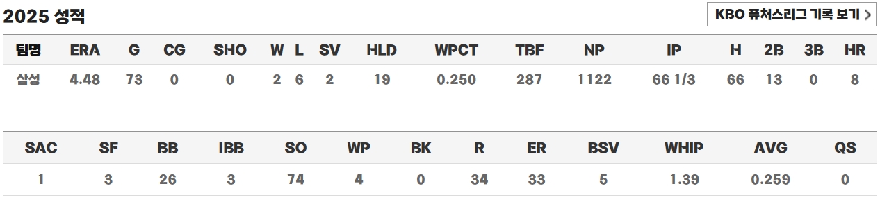 2025시즌 김태훈은 73경기에 출장하여 66.1이닝을 던졌고, 74탈삼진과 함께 2승 6패 2세이브 19홀드, 평균자책점 4.48을 기록했습니다. 시즌 초반과 전반기에는 거의 완벽에 가까운 피칭을 이어가며 “삼성 불펜의 희망”이라는 평가를 받았으나, 6월 22일 롯데전 이후부터 급격한 기복을 보이기 시작했습니다. 이후 8월 중순 잠시 반등하긴 했지만 전반적인 흐름은 2023시즌과 유사했으며, 결국 후반기 체력 저하와 잦은 등판으로 인해 시즌을 아쉽게 마무리했습니다. 전문가들은 그의 두 시즌 연속 후반기 부진을 체력 관리 문제로 지적하면서, 동시에 코칭스태프의 과도한 등판 운영에도 책임이 있다고 분석했습니다. 실제로 김태훈은 고정된 보직 없이 다양한 상황에서 등판하는 ‘애니콜형 불펜’으로 활용되었기 때문입니다.