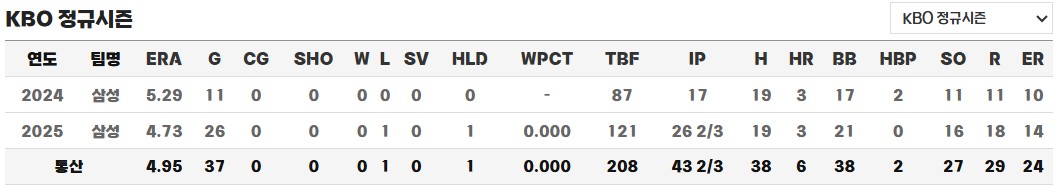 하지만 2025년에도 크게 나아진 기량을 보여주고 있지는 못합니다. 전체적으로는 26경기에서 26.2이닝을 소화하며 평균자책점 4.73, 1패 1홀드의 성적을 기록했습니다. 총 21개의 볼넷을 허용한 점에서 제구 불안이 여전히 뚜렷하게 나타났고, 멘탈적인 부분에서도 보완이 필요하다는 평가를 받았습니다.