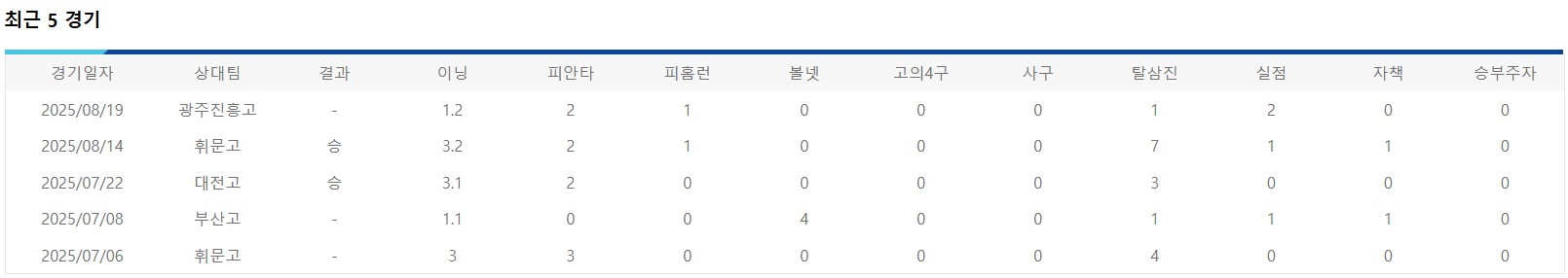 ◇ 2025년 고교야구 최근 5 경기 성적 / 기록