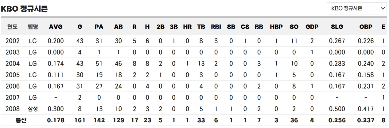 2007년에는 궤양성 대장염으로 인해 전지훈련에도 참가하지 못할 정도로 몸 상태가 좋지 않았습니다. 어렵게 시즌 막바지에 복귀했지만, 9월 SK 와이번스전에서 불운의 실책을 저질러 팀의 승리를 놓치는 결정적인 장면을 만들었습니다. 당시 그 실책은 LG의 포스트시즌 탈락으로 이어지며 팬들에게 깊은 아쉬움을 남겼습니다. 이후 그는 포스트시즌 실패의 상징처럼 불리며 2007년 시즌 종료 후 LG에서 방출되었습니다.