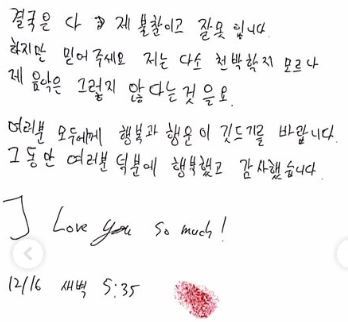 임동혁은 글을 통해 모든 책임은 결국 자신에게 있다고 말하며, 자신의 선택과 행동에 대한 잘못을 인정했습니다. 그럼에도 불구하고 한 가지는 믿어달라며, 자신의 삶이 다소 거칠고 부족해 보일 수는 있어도 음악만큼은 그렇지 않았다는 점을 강조했습니다. 마지막으로 그는 글을 읽는 모든 이들에게 행복과 행운이 함께하길 바란다며, 다시 한 번 감사의 인사를 전했습니다. “그동안 여러분 덕분에 행복했다”, “여러분을 정말 사랑한다”는 말로 편지를 마무리했다고 전해집니다.