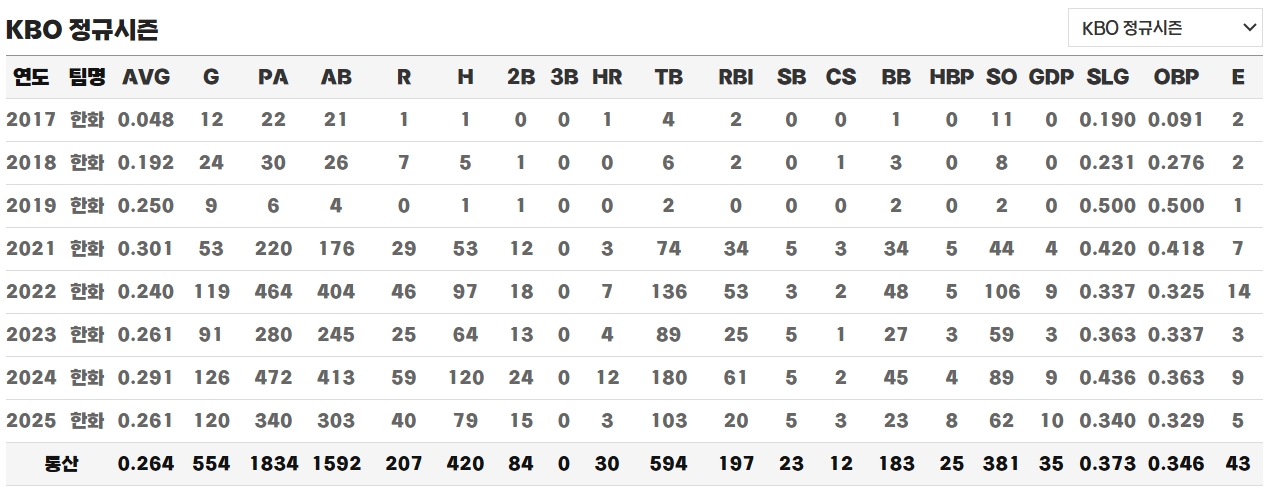 후반기 들어 김태연의 포지션은 점차 우익수로 고정되었습니다. 시즌 종료 후 일본 미야자키에서 열린 마무리캠프에서도 그는 외야 수비에 집중하며 우익수뿐 아니라 좌익수까지 함께 준비했습니다. 정규 훈련이 끝난 뒤에도 엑스트라 훈련을 소화하며 타구 각도가 다른 좌익수 수비에 적응하려 노력했고, 그 결과 외야 양쪽 코너를 소화할 수 있는 자원으로 성장했다고 전해집니다. 다만 시즌 후반으로 갈수록 체력적인 부담이 드러나며 타격감이 다소 떨어진 점은 아쉬움으로 남았습니다. 그럼에도 불구하고 2할 후반대 타율과 두 자릿수 홈런을 기록하며 의미 있는 한 해를 보냈습니다.