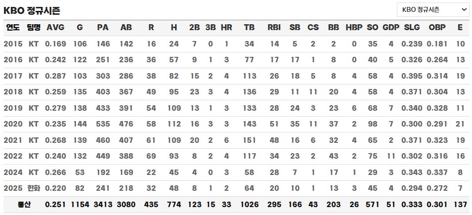 한화 이글스 입단 이후 심우준은 기대와 우려 속에 2025시즌을 맞이했습니다. 시즌 개막 이후 그는 유격수 포지션에서 꾸준히 출전하며 총 82경기에 출장했고, 241타석에서 48안타, 20타점, 10도루를 기록했습니다. 타율은 0.220으로 다소 아쉬운 수준이었고, 45개의 삼진과 13개의 볼넷은 여전히 타격의 불안정함을 보여주는 지표가 되었습니다.
