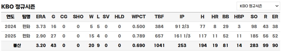 후반기에도 그의 질주는 계속되었습니다. 9월 현재까지 총 27경기에 등판해 161⅓이닝 동안 165개의 탈삼진을 기록했으며, 15승 4패, 평균자책점 2.90, 피안타 117개, 볼넷 52개라는 준수한 성적을 이어가고 있습니다. 특히 탈삼진 능력은 KBO 리그 최고 수준으로, 위기 상황에서 삼진으로 이닝을 마무리하는 장면은 이제 한화 팬들에게 익숙한 광경이 되었습니다. 한화 이글스는 와이스와 폰세라는 확실한 원투펀치를 바탕으로 올 시즌 선두권을 유지하고 있으며, 팬들의 기대 속에 가을야구 진출 가능성도 점차 높아지고 있습니다.