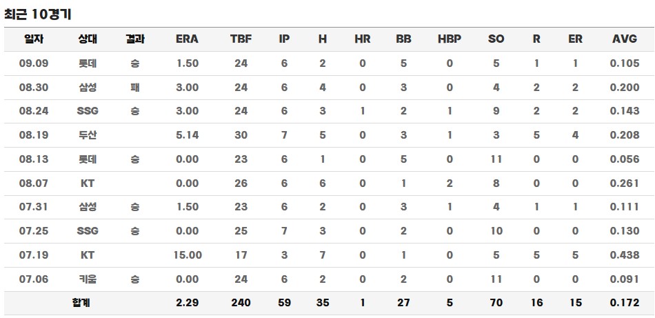 그러나 와이스는 이내 각성했습니다. 시즌이 진행되면서 경기력은 더욱 안정됐고, 점차 KBO 무대에 완벽하게 적응한 모습을 보였습니다. 결국 2025년 전반기에만 개인 커리어 최초로 단일 시즌 10승을 돌파하며 한화 이글스의 원투펀치 중 한 축을 당당히 차지하게 됩니다. 팀 동료이자 에이스인 펠릭스 폰세의 뛰어난 활약에 가려 조명을 많이 받지는 못했지만, 실제로 와이스는 이닝 소화 7위, 탈삼진 4위, sWAR 7위에 오르며 리그 상위권의 성적을 남겼습니다. 타 팀에 있었다면 충분히 1선발을 맡을 수 있을 정도의 기록을 세우며, 팀 선발진에 실질적인 무게감을 더해주었습니다.