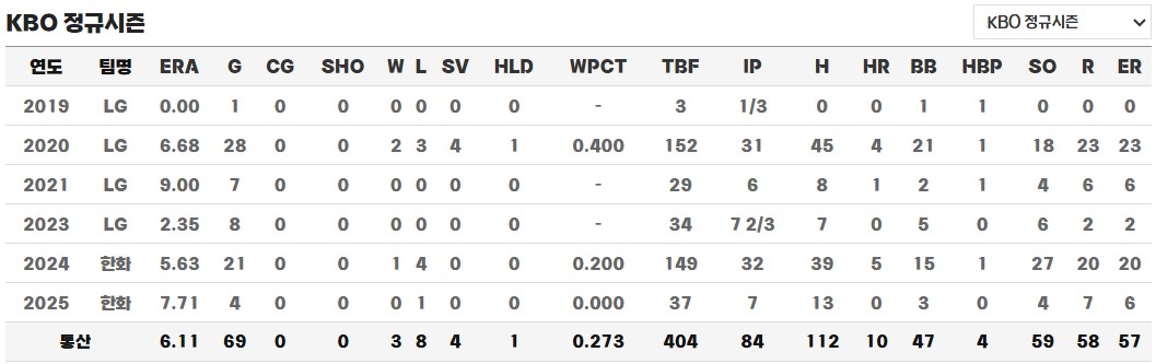 LG 시절에는 아쉽게도 1군 무대에 오르지는 못했고, 퓨처스리그 2군에서는 4경기 4⅓이닝 평균자책점 12.46이라는 다소 부진한 기록을 남겼습니다. 당시 주로 불펜으로 등판했으며, 특히 8월 4일 삼성 2군과의 경기에서는 9회 등판해 삼자범퇴로 이닝을 깔끔하게 마무리하는 모습을 보여주기도 했습니다.