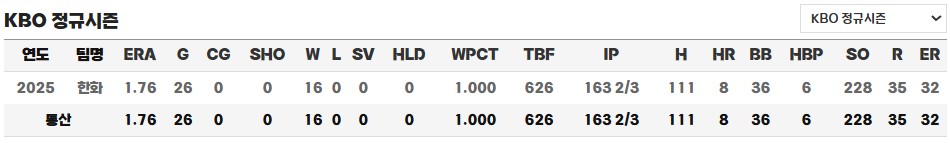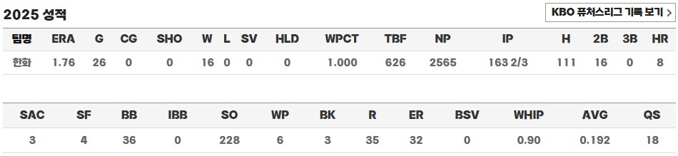 시즌이 후반부로 접어들면서도 패배 없이 26경기 16승 무패의 경이로운 성적을 유지하고 있으며, 팀이 상위권을 유지하는 데 있어 결정적인 역할을 하고 있습니다. 단일 경기 최다 탈삼진, 단일 시즌 최다 탈삼진, 선발 연승 기록 등 수많은 대기록을 하나씩 경신하고 있는 폰세는 지금 한화의 확실한 1선발이자 KBO를 대표하는 에이스 투수로 자리매김했습니다.