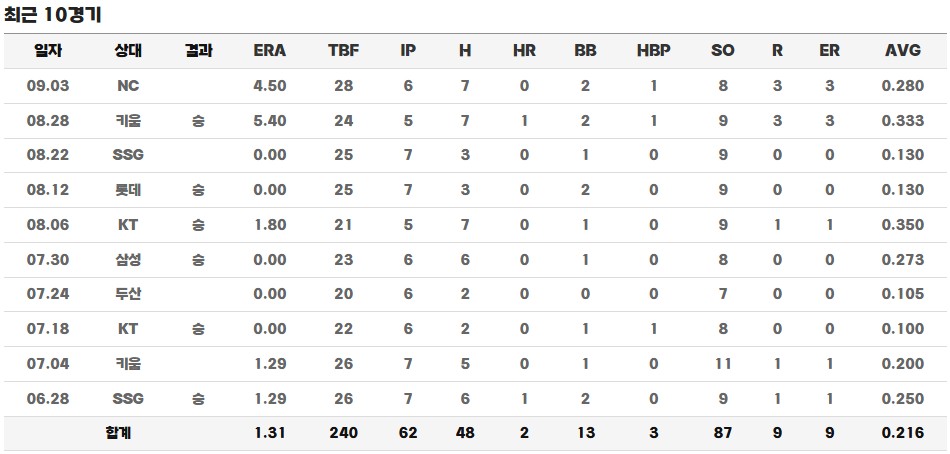 8월에는 선발 등판만으로 연승을 이어가며 KBO 리그 역사상 최다 선발 연승 기록을 눈앞에 두었습니다. 8월 28일 경기에서는 비록 5이닝만 소화했지만, 무려 9개의 탈삼진을 쌓으며 220탈삼진을 기록했고, 이후 9월 3일에는 6이닝 8탈삼진을 추가하며 2021년 미란다가 세운 KBO 단일 시즌 최다 탈삼진 기록(225K)을 넘어 228K까지 달성했습니다.