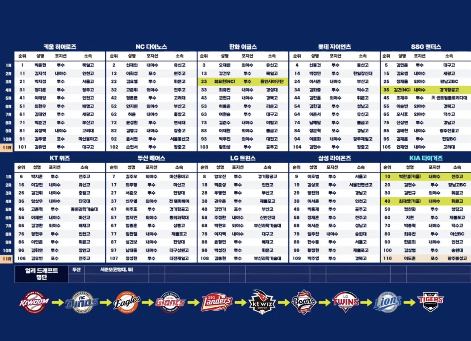* NC 다이노스는 한화 이글스로부터 3라운드 지명권을, SSG 랜더스로부터 4라운드 지명권을 양도받았습니다.