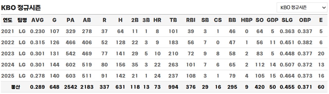 특히 2024년에는 타고투저 흐름과 맞물려 개인 커리어 최고의 시즌을 보내게 됩니다. 데뷔 후 처음으로 20홈런을 돌파하며, 3년 연속 3할 타율을 기록한 것은 물론 144경기 전 경기에 출장하여 602타석 156안타 22홈런, 타율 0.301을 기록했습니다. 이로써 그는 LG 타선의 4번 타자로 확고히 자리 잡으며, 중심 타자로서의 역할도 성공적으로 수행해냈습니다.