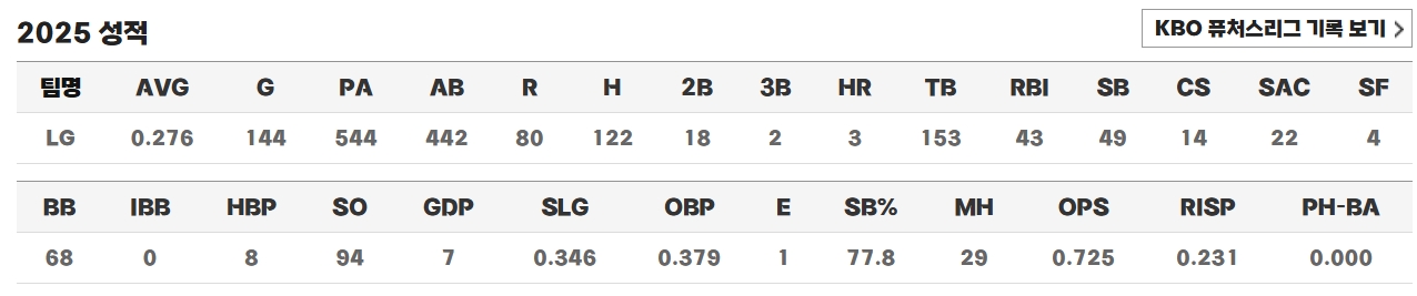 2025년 시즌에는 주장으로서 한층 더 무게감 있는 모습을 보여주었습니다. 144경기 전경기에 출장해 타율 0.276, 122안타, 43타점, 49도루를 기록하며 또 한 번 리그를 대표하는 ‘철강왕’의 면모를 입증했습니다. 개인 통산 다섯 번째 도루왕을 차지하면서 김일권과 함께 KBO 통산 최다 도루왕 공동 1위에 올랐습니다. 이는 LG 트윈스 소속 선수로서는 이대형 이후 15년 만에 탄생한 도루왕 기록이기도 합니다. 시즌 초반에는 다소 부진했으나 5월 이후 급격히 타격감이 오르며 커리어 최고의 시즌을 만들어냈고, 팬들은 그를 ‘진정한 리더’라고 평가했습니다.