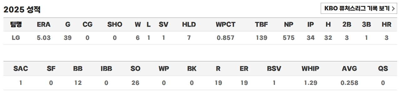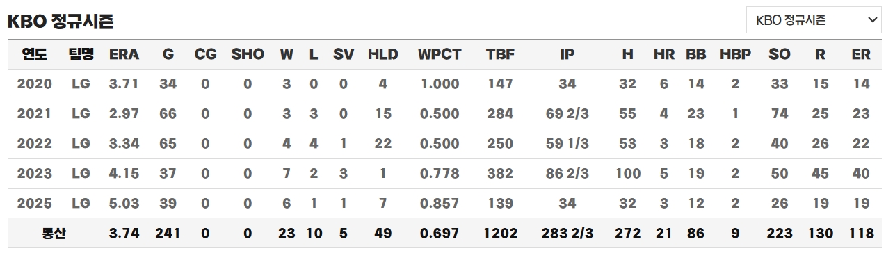 2025년에는 상무에서 복귀한 뒤 다시 LG 트윈스에 합류했습니다. 시즌 초반에는 안정적인 구위를 보여주며 팀의 상승세에 힘을 보탰지만, 후반기에는 체력 저하로 기복 있는 모습을 보이기도 했습니다. 그래도 39경기에 출전해 6승 1패 1세이브 7홀드를 기록하며, 군 복무 공백을 감안하면 충분히 의미 있는 시즌이었다고 평가받습니다.