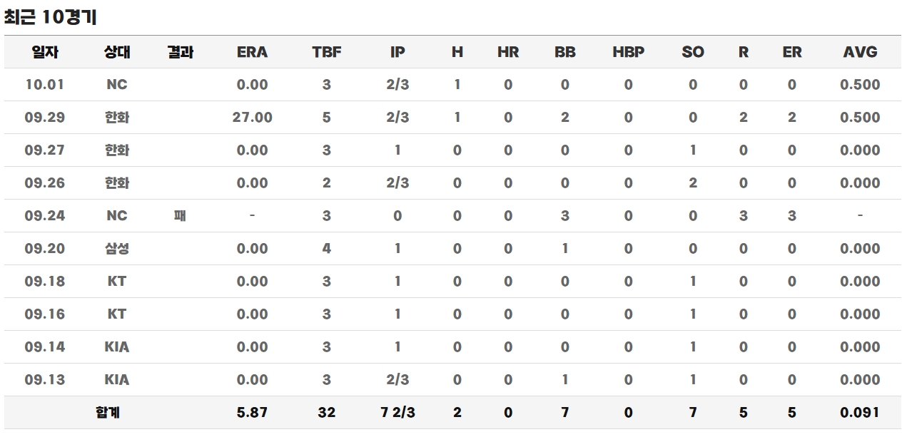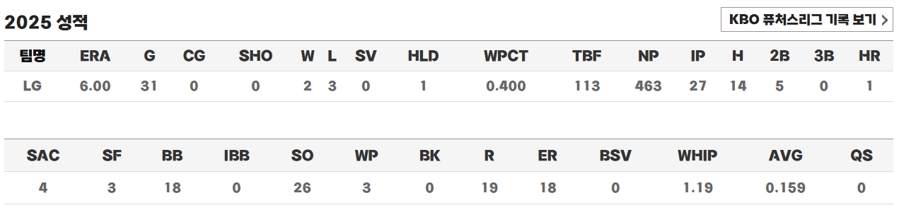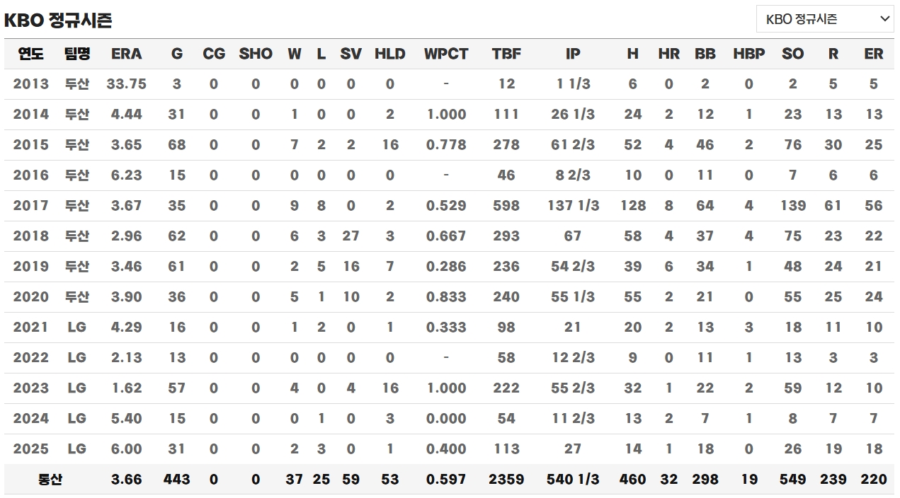2025년 시즌에도 부진은 이어졌습니다. 31경기에 등판해 14피안타, 18자책점을 허용하며 기대에 미치지 못하는 모습을 보였습니다. 볼넷이 많고 위기 상황에서의 제구 불안이 두드러졌습니다. 특히 9월 24일 경기에서는 밀어내기 역전패의 원인이 되며 팬들의 신뢰를 잃었다고 전해집니다. 다만 아직 30대 초반으로 나이가 젊고, 건강만 회복된다면 다시 한 번 반등할 여지는 충분하다는 평가가 있습니다.