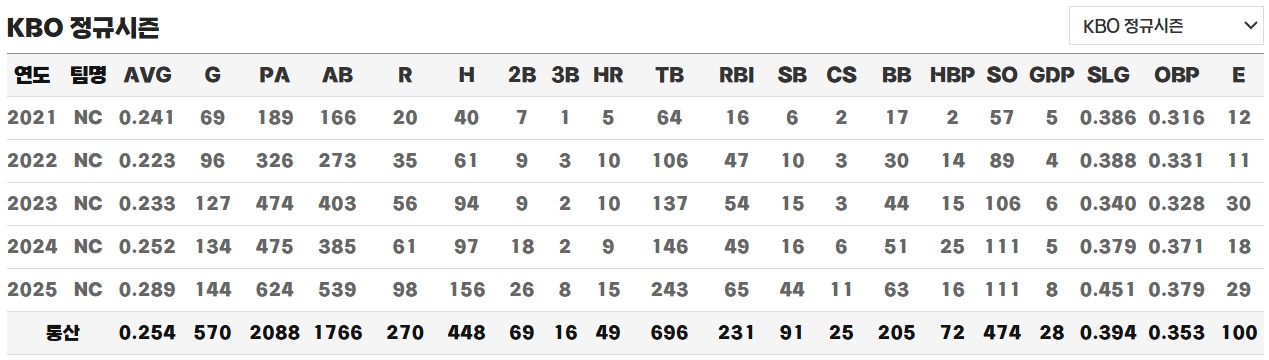 2022년에는 발목 인대 부상으로 개막 엔트리에 들지 못했으나 5월 복귀 이후 꾸준히 1군에 머물며 점차 안정된 모습을 보였습니다. 타율은 0.223으로 다소 낮았지만, 장타력과 수비력에서 발전한 모습을 보이며 NC의 차세대 주전 유격수로 자리 잡았습니다. 특히 수비 지표인 RNG(수비 범위 수치)에서 리그 3위, 수비율에서도 상위권을 기록하며 뛰어난 수비 범위를 증명했습니다. 리그 베테랑 유격수들과 비교해도 뒤처지지 않는 안정적인 수비 능력을 보여주었다고 전해집니다.