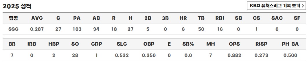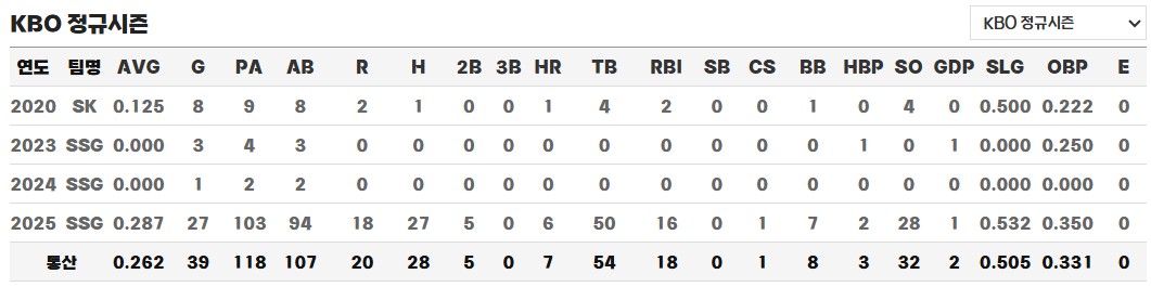 2025년 후반기, 그는 마침내 잠재력을 폭발시켰습니다. 27경기 출전, 103타석 27안타, 6홈런, 타율 0.287을 기록하며 SSG 랜더스 타선의 새로운 힘이 되었습니다. 중요한 순간마다 장타를 터뜨리며 팀의 포스트시즌 진출에 결정적인 기여를 했습니다. 타격 매커니즘이 안정되었고, 무엇보다 자신감 있는 스윙이 눈에 띄게 좋아졌다는 평가를 받았습니다.
